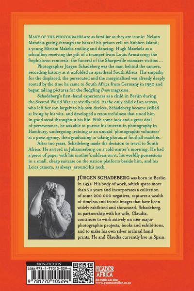 Many of the photographs are as familiar as they are iconic: Nelson Mandela gazing through the bars of his prison cell on Robben Island; a young Miriam Makeba smiling and dancing; Hugh Masekela as a schoolboy receiving the gift of a trumpet from Louis Armstrong; the Sophiatown removals; the funeral of the Sharpeville massacre victims … Photographer Jürgen Schadeberg was the man behind the camera, recording history as it unfolded in apartheid South Africa. His empathy for the displaced, the persecuted and the marginalised was already deeply rooted by the time he came to South Africa from Germany in 1950 and began taking pictures for the fledgling Drum magazine. Schadeberg's first-hand experiences as a child in Berlin during the Second World War are vividly told. As the only child of an actress, who left her son largely to his own devices, Schadeberg became skilled at living by his wits, and developed a resourcefulness that stood him in good stead throughout his life. With some luck and a great deal of perseverance, he was able to pursue his interest in photography in Hamburg, undergoing training as an unpaid 'photographic volunteer' at a press agency, then graduating to taking photos at football matches. After two years, Schadeberg made the decision to travel to South Africa. He arrived in Johannesburg on a cold winter's morning. He had a piece of paper with his mother's address on it, his worldly possessions in a small, cheap suitcase on the station platform beside him, and his Leica camera, as always, around his neck.