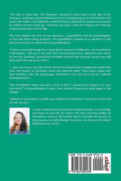 "The Way It Once Was: The Dinosaur," transports hearts back to the Age of the Dinosaurs. A glimpse of primordial beauty from its beginnings to its end enchants and haunts the reader. Lush habitants created for these magnificent creatures once existed for millions of years long ago. Harmony and peace ruled on Pangaea until violence surfaced ushering in the Ice Age.This story follows the lives of two dinosaurs, a grandfather and his granddaughter as they flee flesh eating predators. The grandfather embarks on a narrative of past beloved memories to share with his granddaughter."It was a very long time ago that I speak about my heart, my little one...yet, nonetheless it did happen. I tell you, it was real! And it all took place here, right here even where we are now standing," assured the incredible creature with his great, purple eyes and dark pupils dancing across them.""...Juicy, enormous, succulent fruits and berries beyond one's imagination loaded the trees and bushes, so lusciously sweet and intensely bitter. Thick leaves oozed with each nutritious bite. My long tongue remembers each one even now as I salivate thinking about it...""But, Grandfather when was such a time as this? I cannot even imagine it to ever have been!" His granddaughter's large, dark, almond shaped eyes grew bigger in the twilight."Millions of years before my little one, millions of years before; I was there at the end of it all, you see..."I reside in Manchester-by-the-Sea in Massachusetts. It is a privilege and honor to write for the Father. This story was first written by Him before I wrote it. My humble intent is to make Him known, to bring heaven on earth through my stories. He deserves the Glory! (Matthew 6:33; 13:52)