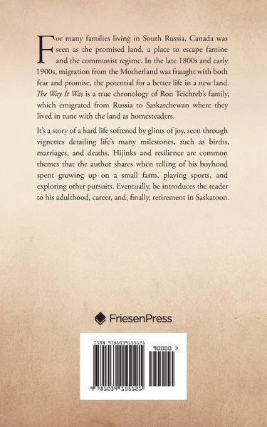 For many families living in South Russia, Canada was seen as the promised land, a place to escape famine and the communist regime. In the late 1800s and early 1900s, migration from the Motherland was fraught with both fear and promise, the potential for a better life in a new land. The Way It Was is a true chronology of Ron Teichreb's family, which emigrated from Russia to Saskatchewan where they lived in tune with the land as homesteaders. It's a story of a hard life softened by glints of joy, seen through vignettes detailing life's many milestones, such as births, marriages, and deaths. Hijinks and resilience are common themes that the author shares when telling of his boyhood spent growing up on a small farm, playing sports, and exploring other pursuits. Eventually, he introduces the reader to his adulthood, career, and, finally, retirement in Saskatoon.