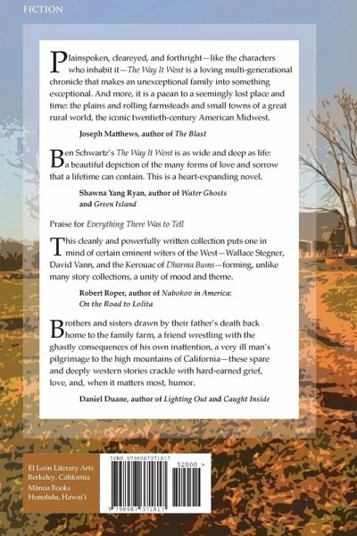 In THE WAY IT WENT, novelist Ben Schwartz weaves a beautifully elegiac history of a midwestern farm family from the 1930s to the present. Acknowledging that family histories are as much fiction as fact, the novel offers different voices and versions, mainly three erudite, articulate women, schoolteachers all. The chief character, Elspeth, begins the history: her childhood in Missouri, her years in college. And then, after World War II, meeting Avery, the soldier she will marry, whom she brings home to Missouri. There are strong male voices as well, especially Ned, brother of the soldier, who details the backstory of their North Dakota family. Thus we come to know the struggles of Avery, a loving, genial man deeply wounded by war, through the narratives spun by mother, wife, brother, sister-in-law, and mother-in-law. In twelve chapters spanning sixty years, the author builds a luminous, multifaceted exploration of a family appraising their love for each other-needs, wants, satisfactions, missteps, failings. What emerges is a deeply moving requiem for a land, a people, and a time past but treasured.