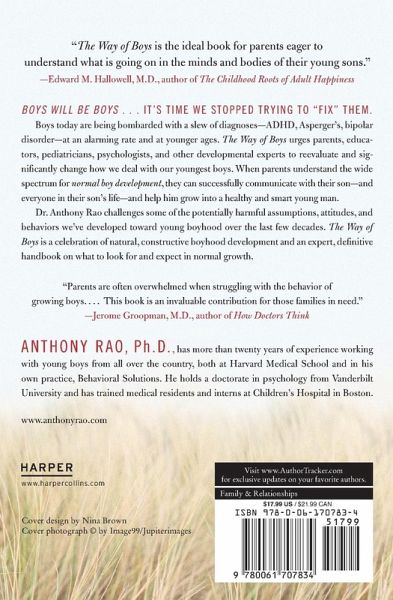 Boys will be boys . . . It's time we stopped trying to "fix" them. Boys today are being bombarded with a slew of diagnoses--ADHD, Asperger's, bipolar disorder--at an alarming rate and at younger ages. The Way of Boys urges parents, educators, pediatricians, psychologists, and other developmental experts to reevaluate and significantly change how we deal with our youngest boys. When parents understand the wide spectrum for normal boy development, they can successfully communicate with their son--and everyone in their son's life--and help him grow into a healthy and smart young man. Dr. Anthony Rao challenges some of the potentially harmful assumptions, attitudes, and behaviors we've developed toward young boyhood over the last few decades. The Way of Boys is a celebration of natural, constructive boyhood development and an expert, definitive handbook on what to look for and expect in normal growth.