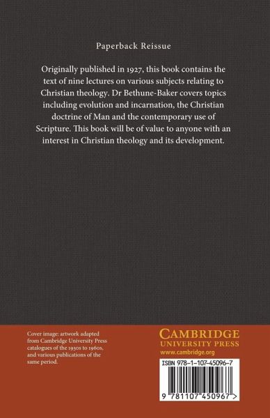 Originally published in 1927, this book contains the text of nine lectures on various subjects relating to Christian theology. Dr Bethune-Baker covers topics including evolution and incarnation, the Christian doctrine of Man and the contemporary use of Scripture. This book will be of value to anyone with an interest in Christian theology and its development.
