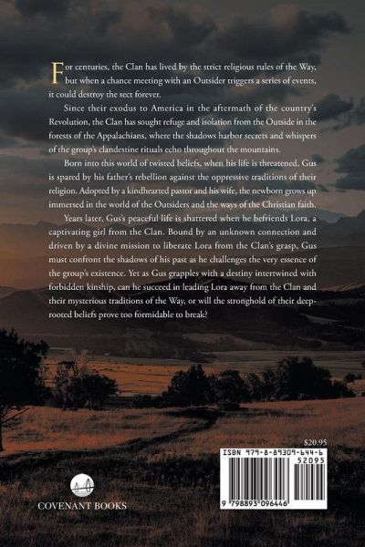 For centuries, the Clan has lived by the strict religious rules of the Way, but when a chance meeting with an Outsider triggers a series of events, it could destroy the sect forever. Since their exodus to America in the aftermath of the country's Revolution, the Clan has sought refuge and isolation from the Outside in the forests of the Appalachians, where the shadows harbor secrets and whispers of the group's clandestine rituals echo throughout the mountains. Born into this world of twisted beliefs, when his life is threatened, Gus is spared by his father's rebellion against the oppressive traditions of their religion. Adopted by a kindhearted pastor and his wife, the newborn grows up immersed in the world of the Outsiders and the ways of the Christian faith. Years later, Gus's peaceful life is shattered when he befriends Lora, a captivating girl from the Clan. Bound by an unknown connection and driven by a divine mission to liberate Lora from the Clan's grasp, Gus must confront the shadows of his past as he challenges the very essence of the group's existence. Yet as Gus grapples with a destiny intertwined with forbidden kinship, can he succeed in leading Lora away from the Clan and their mysterious traditions of the Way, or will the stronghold of their deep-rooted beliefs prove too formidable to break?
