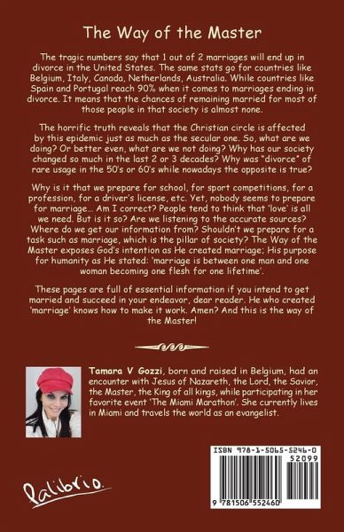 The tragic numbers say that 1 out of 2 marriages will end up in divorce in the United States. The same stats go for countries like Belgium, Italy, Canada, Netherlands, Australia. While countries like Spain and Portugal reach 90% when it comes to marriages ending in divorce. It means that the chances of remaining married for most of those people in that society is almost none. The horrific truth reveals that the Christian circle is affected by this epidemic just as much as the secular one. So, what are we doing? Or better even, what are we not doing? Why has our society changed so much in the last 2 or 3 decades? Why was "divorce" of rare usage in the 50's or 60's while nowadays the opposite is true? Why is it that we prepare for school, for sport competitions, for a profession, for a driver's license, etc. Yet, nobody seems to prepare for marriage... Am I correct? People tend to think that 'love' is all we need. But is it so? Are we listening to the accurate sources? Where do we get our information from? Shouldn't we prepare for a task such as marriage, which is the pillar of society? The Way of the Master exposes God's intention as He created marriage; His purpose for humanity as He stated: 'marriage is between one man and one woman becoming one flesh for one lifetime'. These pages are full of essential information if you intend to get married and succeed in your endeavor, dear reader. He who created 'marriage' knows how to make it work. Amen? And this is the way of the Master!
