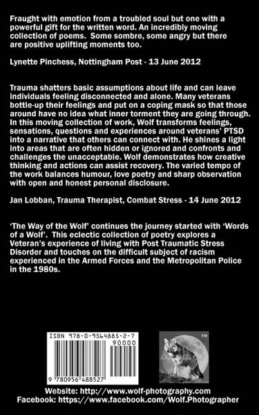'The Way of the Wolf' continues the journey started with 'Words of a Wolf'. This eclectic collection of poetry explores a Veteran's experience of living with Post Traumatic Stress Disorder and touches on the difficult subject of racism experienced in the British Armed Forces and Metropolitan Police in the 1980s, as well as more positive and uplifting moments. It continues to provide an insight few will have seen to date. This title is part of a larger project that I am running, the aim of which is to continue raising awareness of how PTSD affects Veterans and their families, to promote creativity as a way of coping with PTSD and to educate disabled artists on their Intellectual Property rights and help them to safeguard their work on the internet. Income generated from the book will allow me to continue my therapeutic work and go towards funding an exhibition of photography and poetry with the same aims. If there are any profits, a percentage will go to the Occupational Therapy units of Combat Stress to provide materials to enable Veterans to do some form of Creative Therapy. Reviews: Fraught with emotion from a troubled soul but one with a powerful gift for the written word. An incredibly moving collection of poems. Some sombre, some angry but there are positive uplifting moments too. Lynette Pinchess Nottingham Post Trauma shatters basic assumptions about life and can leave individuals feeling disconnected and alone. Many veterans bottle-up their feelings and put on a coping mask so that those around have no idea what inner torment they are going through. In this moving collection of work, Wolf transforms feelings, sensations, questions and experiences around veterans' PTSD into a narrative that others can connect with. He shines a light into areas that are often hidden or ignored and confronts and challenges the unacceptable. Wolf demonstrates how creative thinking and actions can assist recovery. The varied tempo of the work balances humour, love poetry and sharp observation with open and honest personal disclosure. Jan Lobban Trauma Therapist Combat Stress