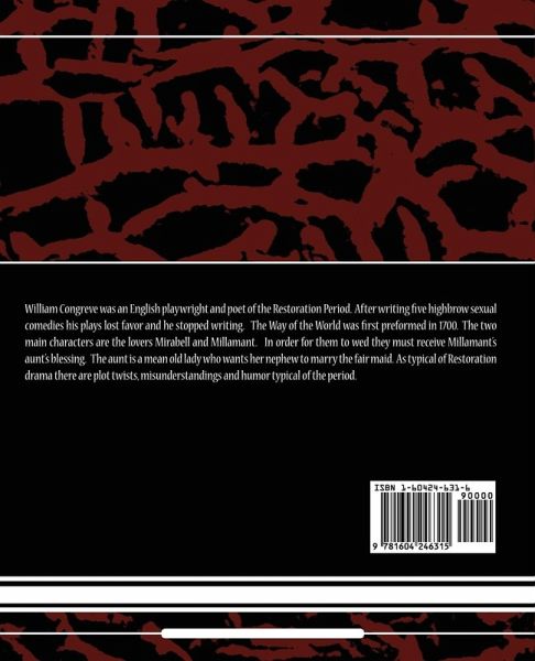 William Congreve was an English playwright and poet of the Restoration Period. After writing five highbrow sexual comedies his plays lost favor and he stopped writing. The Way of the World was first preformed in 1700. The two main characters are the lovers Mirabell and Millamant. In order for them to wed they must receive Millamant's aunt's blessing. The aunt is a mean old lady who wants her nephew to marry the fair maid. As typical of Restoration drama there are plot twists, misunderstandings and humor typical of the period.