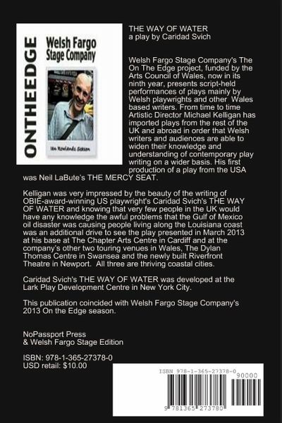 THE WAY OF WATER is a play by Caridad Svich that pits the aftermath of the Deepwater Horizon 2010 BP oil spill in the Gulf of Mexico next to the lives of those affected by it. It's a story about four people making do as best they can, living their lives, and trying to stay afloat in the land of many compromised dreams, as the devastation of a health and environmental crisis scandal in the US Gulf is played out on a human scale. It's a play about poverty in America, rumors and truth, what is said and what gets written, and the quest for an honorable life. This edition of the play coincided with Welsh Fargo Stage Company's presentation of the play as part of its 2013 On the Edge Ian Rowlands season in Wales, UK.