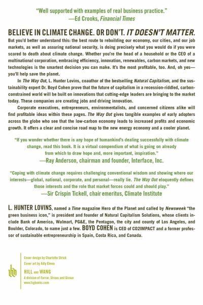 Believe in climate change. Or don't. It doesn't matter. But you'd better understand this: the best route to rebuilding our economy, our cities, and our job markets, as well as assuring national security, is doing precisely what you would do if you were scared to death about climate change. Whether you're the head of a household or the CEO of a multinational corporation, embracing efficiency, innovation, renewables, carbon markets, and new technologies is the smartest decision you can make. It's the most profitable, too. And, oh yes--you'll help save the planet. In The Way Out, L. Hunter Lovins, coauthor of the bestselling Natural Capitalism, and the sustainability expert Boyd Cohen prove that the future of capitalism in a recession-riddled, carbon-constrained world will be built on innovations that cutting-edge leaders are bringing to the market today. These companies are creating jobs and driving innovation. The Way Out delivers hundreds of in-depth case studies of international corporations, small businesses, NGOs, and municipalities to prove that energy efficiency and renewable resources are already driving prosperity. While highlighting business opportunities across a range of sectors--including energy, construction, transportation, and agriculture technologies--Lovins and Cohen also show why the ex-CIA director Jim Woolsey drives a solar-powered plugin hybrid vehicle. His bumper sticker says it all: "Osama bin Laden hates my car." Corporate executives, entrepreneurs, environmentalists, and concerned citizens alike will find profitable ideas within these pages. In ten information-packed chapters, The Way Out gives tangible examples of early adopters across the globe who see that the low-carbon economy leads to increased profits and economic growth. It offers a clear and concise road map to the new energy economy and a cooler planet. Previously published under the title Climate Capitalism