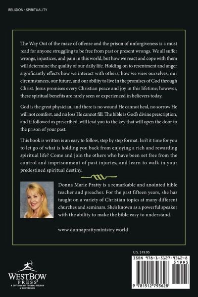 The Way Out of the maze of offense and the prison of unforgiveness is a must read for anyone struggling to be free from past or present wrongs. We all suffer wrongs, injustices, and pain in this world, but how we react and cope with them will determine the quality of our daily life. Holding on to resentment and anger significantly effects how we interact with others, how we view ourselves, our circumstances, our future, and our ability to live in the promises of God through Christ. Jesus promises every Christian peace and joy in this lifetime; however, these spiritual benefits are rarely seen or experienced in believers today. God is the great physician, and there is no wound He cannot heal, no sorrow He will not comfort, and no loss He cannot fill. The bible is God's divine prescription, and if followed as prescribed, will lead you to the key that will open the door to the prison of your past. This book is written is an easy to follow, step by step format. Isn't it time for you to let go of what is holding you back from enjoying a rich and rewarding spiritual life? Come and join the others who have been set free from the control and imprisonment of past injuries, and learn to walk in your predestined spiritual destiny.