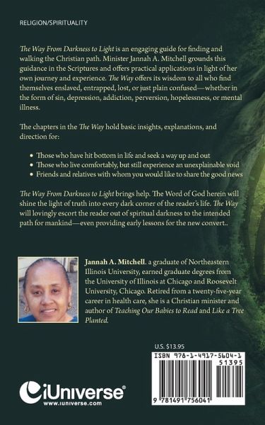 The Way From Darkness to Light is an engaging guide for finding and walking the Christian path. Minister Jannah A. Mitchell grounds this guidance in the Scriptures and offers practical applications in light of her own journey and experience. The Way offers its wisdom to all who find themselves enslaved, entrapped, lost, or just plain confused-whether in the form of sin, depression, addiction, perversion, hopelessness, or mental illness. The chapters in the The Way hold basic insights, explanations, and direction for: Those who have hit bottom in life and seek a way up and out Those who live comfortably, but still experience an unexplainable void Friends and relatives with whom you would like to share the good news The Way From Darkness to Light brings help. The Word of God herein will shine the light of truth into every dark corner of the reader's life. The Way will lovingly escort the reader out of spiritual darkness to the intended path for mankind-even providing early lessons for the new convert..
