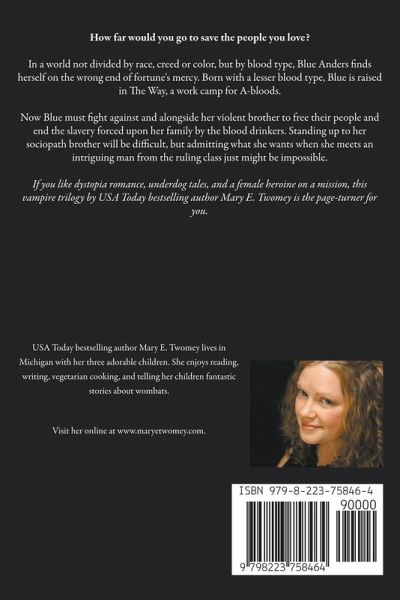 How far would you go to save the people you love? In a world not divided by race, creed or color, but by blood type, Blue Anders finds herself on the wrong end of fortune's mercy. Born with a lesser blood type, Blue is raised in The Way, a work camp for A-bloods. Now Blue must fight against and alongside her violent brother to free their people and end the slavery forced upon her family by the blood drinkers. Standing up to her sociopath brother will be difficult, but admitting what she wants when she meets an intriguing man from the ruling class just might be impossible. If you like dystopia romance, underdog tales, and a female heroine on a mission, this vampire trilogy is the page-turner for you. "The Way" is book one in a dystopian trilogy, written by USA Today bestselling author Mary E. Twomey. Start a new adventure, and read book one today.