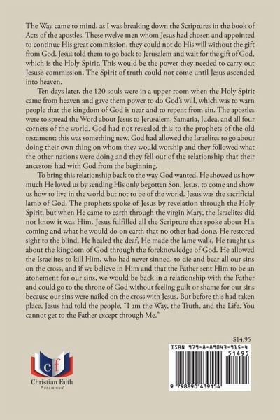The Way came to mind, as I was breaking down the Scriptures in the book of Acts of the apostles. These twelve men whom Jesus had chosen and appointed to continue His great commission, they could not do His will without the gift from God. Jesus told them to go back to Jerusalem and wait for the gift of God, which is the Holy Spirit. This would be the power they needed to carry out Jesus's commission. The Spirit of truth could not come until Jesus ascended into heaven. Ten days later, the 120 souls were in a upper room when the Holy Spirit came from heaven and gave them power to do God's will, which was to warn people that the kingdom of God is near and to repent from sin. The apostles were to spread the Word about Jesus to Jerusalem, Samaria, Judea, and all four corners of the world. God had not revealed this to the prophets of the old testament; this was something new. God had allowed the Israelites to go about doing their own thing on whom they would worship and they followed what the other nations were doing and they fell out of the relationship that their ancestors had with God from the beginning. To bring this relationship back to the way God wanted, He showed us how much He loved us by sending His only begotten Son, Jesus, to come and show us how to live in the world but not to be of the world. Jesus was the sacrificial lamb of God. The prophets spoke of Jesus by revelation through the Holy Spirit, but when He came to earth through the virgin Mary, the Israelites did not know it was Him. Jesus fulfilled all the Scripture that spoke about His coming and what he would do on earth that no other had done. He restored sight to the blind, He healed the deaf, He made the lame walk, He taught us about the kingdom of God through the foreknowledge of God. He allowed the Israelites to kill Him, who had never sinned, to die and bear all our sins on the cross, and if we believe in Him and that the Father sent Him to be an atonement for our sins, we would be back in a relationship with the Father and could go to the throne of God without feeling guilt or shame for our sins because our sins were nailed on the cross with Jesus. But before this had taken place, Jesus had told the people, "I am the Way, the Truth, and the Life. You cannot get to the Father except through Me."
