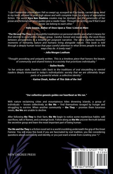 "Our collective genesis guides our heartbeat as We run." With nature reclaiming cities and mountainous tides drowning islands, a group of individuals - known collectively as the We - find themselves ravaged by hunger and struggling to survive. When another community - the They - promise them luxurious meals, the We are unable to decline. After following the They to their farm, the We begin to notice some mysterious habits: odd sacrifices, talk of flames, and a strange book. Follow along as the We uncover the truth behind the secretive group and learn the most important part of being human. The We and the They is a fiction novel set in a world crumbling underneath the grip of the Great Famine. You will enjoy this book if you are fascinated by oral tradition, you like considering questions about community and identity, or you just want a break from curating your "I."