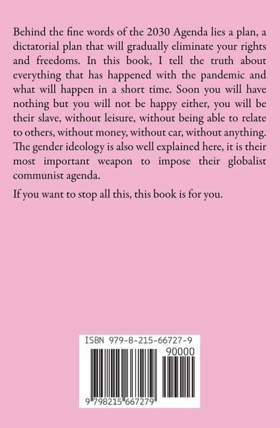 Behind the fine words of the 2030 Agenda lies a plan, a dictatorial plan that will gradually eliminate your rights and freedoms. In this book, I tell the truth about everything that has happened with the pandemic and what will happen in a short time. Soon you will have nothing but you will not be happy either, you will be their slave, without leisure, without being able to relate to others, without money, without car, without anything. The gender ideology is also well explained here, it is their most important weapon to impose their globalist communist agenda. If you want to stop all this, this book is for you.