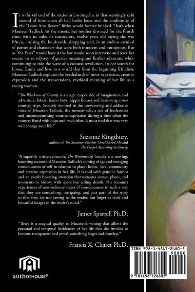 It is the tail end of the sixties in Los Angeles, in that seemingly split second of time when all hell broke loose and the conformity of the "Leave it to Beaver" fifties would forever be shed. That's when Maureen Tadlock hit the streets, her mother divorced for the forth time, with no rules or constraints, twelve years old saying she was fifteen, cruising the boulevards, dropping acid, in an endless carnival of parties and characters that were both innocent and outrageous. But as "the Fates" would have it the law would soon intervene and reset her course on an odyssey of greater meaning and further adventure while continuing to ride the wave of a cultural revolution. In her search for home, family and love in a world that from the beginning felt alien, Maureen Tadlock explores the borderlands of inner experience, creative expression and the transcendent, mythical meaning of her life as a young woman. "The Weakness of Gravity is a magic carpet ride of imagination and adventure, bikers, barrio boys, hippie houses and harrowing cross-country trips. Securely moored in the unwavering and addictive voice of Maureen Tadlock, the memoir tells a tale of fearlessness and uncompromising creative expression during a time when the country flared with hope and revolution. A must read that may very well change your life." Suzanne Kingsbury, author of The Summer Fletcher Greel Loved Me and The Gospel According to Gracey. "A superbly written memoir, The Weakness of Gravity is a moving, haunting account of Maureen Tadlock's coming of age and emerging consciousness of self in relation to place, home, love, community and creative expression in her life. It is told with genuine humor and an evenly hovering attention that recreates scenes, places, and moments in history with spare but telling details. She recounts experiences of non-ordinary states of consciousness in such a way that they are compelling, intriguing, and just part of the story so that they are not jarring to the reader, but linger as vivid and beautiful images in the reader's mind." James Sparrell Ph.D. "There is a magical quality to Maureen's writing that allows the personal and temporal incidences of her life that she invokes to become transparent and reveal something larger and timeless." Francis X. Charet Ph.D.