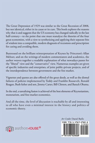 The Great Depression of 1929 was similar to the Great Recession of 2008, but not identical, either in its cause or its cure. This book explores the reasons why that is and suggests that the US economy has changed radically in the last half-century—to the point that one must reanalyze the theories of the four great economists, with a view to synthesizing and applying their separate bits of wisdom into a compatible, modern diagnosis of recessions and prescription for curing and avoiding them. Buttressed on the brilliant reinterpretation of Keynes by Princeton’s Allan Meltzer, and on the writings of modern commentators and academics, the author weaves together a readable explanation of what nowadays passes for the "liberal" view and the "conservative" view. Numerous examples are given of specific industries and enterprises, of joint public-private projects, and of the interdependence between government and the free market. Vignettes and quotes are also offered of the great deeds, as well as the dismal failures of policies implemented by Teddy and Franklin Roosevelt, Ronald Reagan, Bush father and son, Jimmy Carter, Bill Clinton, and Barack Obama. In the end, a tantalizing fusion is achieved of the best elements of Keynesianism, monetarism, and free-market economics. And all the time, the level of discussion is reachable by all and interesting to all who have even a minimal interest in the history and politics of economic theory.