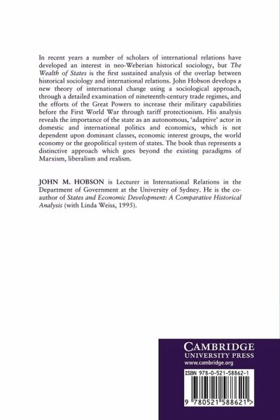In recent years a number of scholars of international relations have developed an interest in neo-Weberian historical sociology, but The Wealth of States is the first sustained analysis of the overlap between historical sociology and international relations. John Hobson develops a new theory of international change using a sociological approach, through a detailed examination of nineteenth-century trade regimes, and the efforts of the Great Powers to increase their military capabilities before the First World War through tariff protectionism. His analysis reveals the importance of the state as an autonomous, 'adaptive' actor in international politics and economics, which is not dependent upon dominant economic classes. The book thus represents a distinctive approach which goes beyond the existing paradigms of marxism, liberalism, and realism.