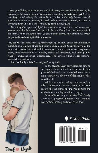 . . . (my grandfather) said his father had died during the war. When he said it, he suddenly got this look in his eyes. Like he wanted something he could never get. I sensed something painful inside of him. Vulnerable and broken. Instinctively, I wanted to reach out to him. But I had no concept of the depth of the ocean he was swimming in . . . And so, the moment passed. And then he was smiling again. Back on point. For a long time after that, I felt like a window had opened in that moment-a window through which terrible secrets could be seen. If only I had the courage to look and the wisdom to understand them. Clues that could unlock a mystery that throbbed in our familial blood and infiltrated our dreams. Joey Ter-Mitchell spent his early years caught up in vicious cycles of bad influence, including crime, drugs, abuse, and psychological damage. Unsurprisingly, his life went on to become laden with addictions, recovery, and relapses as well as physical abuse, toxic relationships, car wrecks, arrests, jail, probation, and other painful realities-including "dying" at least once. He spent years riding a roller coaster of shame, chaos, and pain. But, thankfully, this isn't where Joey's story ends. In The Wealthy Loser, Joey describes how he was spared from ultimate destruction by the grace of God, and how he was led to uncover a family mystery at the core of the madness that ruled his life. While searching for healing and answers, Joey takes a journey into the past, where he discovers secrets that he comes to understand were the catalysts for a multi-generational tragedy. Beautifully weaving two stories, The Wealthy Loser is a poignant memoir about survival, redemption, healing, and most of all, love.