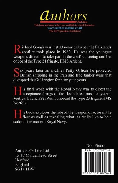 Richard Gough was just 23 years old when the Falklands conflict took place in 1982. He was the youngest weapons director to take part in the conflict, seeing combat onboard the Type 21 frigate, HMS Ardent. Six years later as a Chief Petty Officer he protected British shipping in the Iran and Iraq tanker wars that disrupted the Gulf region for nearly ten years. His final work with the Royal Navy was to direct the acceptance firings of the fleets latest missile system, Vertical Launch SeaWolf, onboard the Type 23 frigate HMS Norfolk. His book explores the role of the weapon director in the fleet as well as revealing what it's really like to be a sailor in the modern Royal Navy.