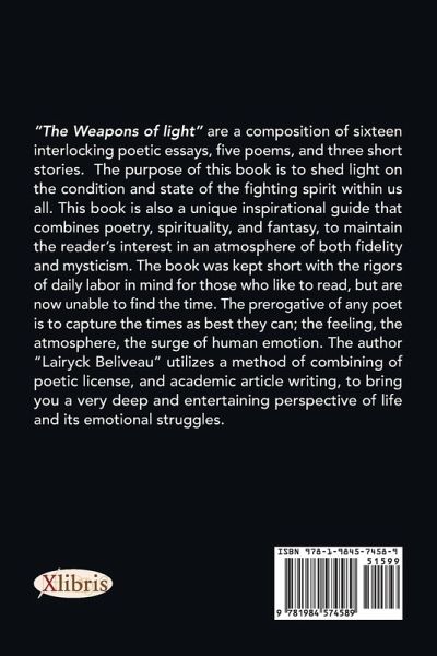 The Weapons of Light is a composition of sixteen interlocking poetic essays, five poems, and three short stories. The purpose of this book is to shed light on the condition and state of the fighting spirit within us all. This book is also a unique inspirational guide that combines poetry, spirituality, and fantasy to maintain the reader's interest in an atmosphere of both fidelity and mysticism. The book is kept short with the rigors of daily labor in mind for those who like to read but are now unable to find time. The prerogative of any poet is to capture the times as best as they can: the feeling, the atmosphere, and the surge of human emotion. The author, Lairyck Beliveau, utilizes a method of combining poetic license and academic article writing to bring you a very deep and entertaining perspective of life and its emotional struggles.