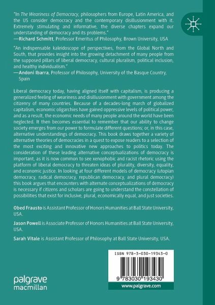 Liberal democracy today, having aligned itself with capitalism, is producing a generalized feeling of weariness and disillusionment with government among the citizenry of many countries. Because of a decades-long march of globalized capitalism, economic oligarchies have gained oppressive levels of political power, and as a result, the economic needs of many people around the world have been neglected. It then becomes essential to remember that our ability to change society emerges from our power to formulate different questions; or, in this case, alternative understandings of democracy. This book draws together a variety of alternative theories of democracies in a quest to expose readers to a selection of the most exciting and innovative new approaches to politics today. The consideration of these leading alternative conceptualizations of democracy is important, as it is now common to see xenophobic and racist rhetoric using the platform of liberal democracy to threaten ideasof plurality, diversity, equality, and economic justice. In looking at four different models of democracy (utopian democracy, radical democracy, republican democracy, and plural democracy) this book argues that encounters with alternate conceptualizations of democracy is necessary if citizens and scholars are going to understand the constellation of possibilities that exist for inclusive, plural, economically equal, and just societies.
