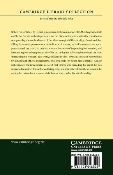Robert Fitzroy (1805-65) is best remembered as the commander of HMS Beagle who took on Charles Darwin as the Ship's naturalist, but his most important scientific contribution was probably the establishment of the Meteorological Office in 1854. Convinced that falling barometric pressure was an indicator of storms, he had barometers set up at ports around the coast, so that boats would be aware of impending bad weather, and later had reports telegraphed to his office in London for collation; he invented the term 'forecasting the weather'. This work, published in 1863, gives an account of observations by himself and others, experiments, and proposals for future developments. Almost unbelievably, the Government declared that Fitzroy was exceeding his remit: he was instructed to restrict himself to collecting data, and it is believed that the depression he suffered at this setback was one of the factors which led to his suicide in 1865.