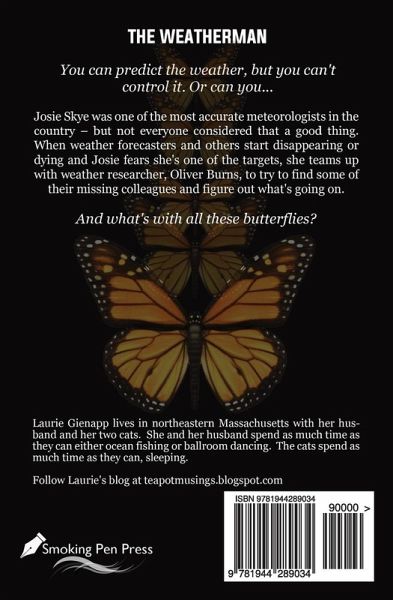 Josie Skye was one of the most accurate meteorologists in the country - but not everyone considered that a good thing. When weather forecasters and others start disappearing or dying and Josie fears she's one of the targets, she teams up with weather researcher, Oliver Burns, to try to find some of their missing colleagues and figure out what's going on. And what's with all these butterflies? The Weatherman is a science fiction adventure, featuring Josie Skye, a middle-age meteorologist. This science-fiction adventure story with a mystery twist has readers begging for a sequel.