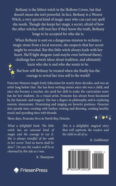 Bethany is the littlest witch in the Hollows Coven, but that doesn't mean she isn't powerful. In fact, Bethany is a Weaver Witch, a very special kind of magic-user who can cast any spell she needs. Though she keeps her magic a secret, afraid of how the other witches will treat her if they know the truth, Bethany longs to be accepted for who she is. When Bethany is sent on a dangerous mission to reclaim a magic stone from a local sorcerer, she suspects that her secret might be revealed. But this little witch always leads with her heart. She'll fight dragons (and maybe even befriend them), challenge her coven's ideas about tradition, and ultimately learn who she is and who she wants to be. But how will Bethany be treated when she finally has the courage to reveal her true self to the world?