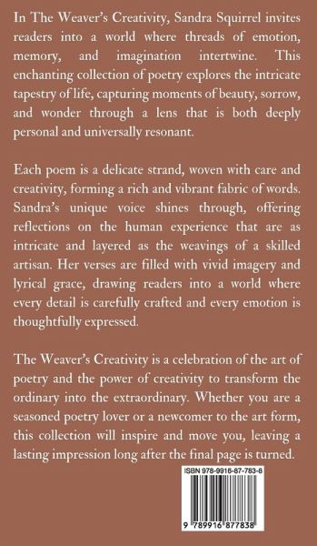 In The Weaver's Creativity, Sandra Squirrel invites readers into a world where threads of emotion, memory, and imagination intertwine. This enchanting collection of poetry explores the intricate tapestry of life, capturing moments of beauty, sorrow, and wonder through a lens that is both deeply personal and universally resonant. Each poem is a delicate strand, woven with care and creativity, forming a rich and vibrant fabric of words. Sandra's unique voice shines through, offering reflections on the human experience that are as intricate and layered as the weavings of a skilled artisan. Her verses are filled with vivid imagery and lyrical grace, drawing readers into a world where every detail is carefully crafted and every emotion is thoughtfully expressed. The Weaver's Creativity is a celebration of the art of poetry and the power of creativity to transform the ordinary into the extraordinary. Whether you are a seasoned poetry lover or a newcomer to the art form, this collection will inspire and move you, leaving a lasting impression long after the final page is turned. Copyright © 2024 Book Fairy Publishing