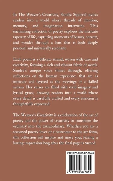 In The Weaver's Creativity, Sandra Squirrel invites readers into a world where threads of emotion, memory, and imagination intertwine. This enchanting collection of poetry explores the intricate tapestry of life, capturing moments of beauty, sorrow, and wonder through a lens that is both deeply personal and universally resonant. Each poem is a delicate strand, woven with care and creativity, forming a rich and vibrant fabric of words. Sandra's unique voice shines through, offering reflections on the human experience that are as intricate and layered as the weavings of a skilled artisan. Her verses are filled with vivid imagery and lyrical grace, drawing readers into a world where every detail is carefully crafted and every emotion is thoughtfully expressed. The Weaver's Creativity is a celebration of the art of poetry and the power of creativity to transform the ordinary into the extraordinary. Whether you are a seasoned poetry lover or a newcomer to the art form, this collection will inspire and move you, leaving a lasting impression long after the final page is turned. Copyright © 2024 Book Fairy Publishing