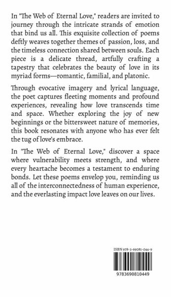 In "The Web of Eternal Love," readers are invited to journey through the intricate strands of emotion that bind us all. This exquisite collection of poems deftly weaves together themes of passion, loss, and the timeless connection shared between souls. Each piece is a delicate thread, artfully crafting a tapestry that celebrates the beauty of love in its myriad forms-romantic, familial, and platonic. Through evocative imagery and lyrical language, the poet captures fleeting moments and profound experiences, revealing how love transcends time and space. Whether exploring the joy of new beginnings or the bittersweet nature of memories, this book resonates with anyone who has ever felt the tug of love's embrace. In "The Web of Eternal Love," discover a space where vulnerability meets strength, and where every heartache becomes a testament to enduring bonds. Let these poems envelop you, reminding us all of the interconnectedness of human experience, and the everlasting impact love leaves on our lives.