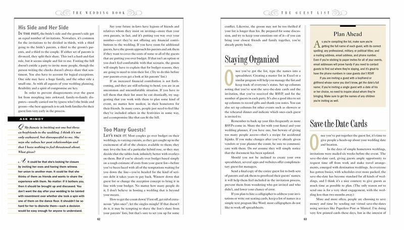 From celebrity wedding planner Mindy Weiss, The Wedding Book is the wedding bible: the most complete, lively, handholding, step-by-step guide to help every couple have a perfect weddingâ no matter their budget, taste, or personalities.