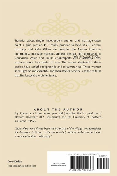 The Wedding Plan is a collection of short stories highlighting relationships and marriage. Statistics about single black women and their odds of getting married sparked the creation of characters who dispel the stereotypes. The stories of these couples cross color lines and class lines. The men and women in these stories are funny and spirited, resolute and torn. "Miss Independent," "Faithful" "Beauty," "The Flower Arrangement," "Worker's Comp," and "The Surprise" are included.