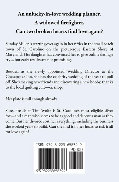 An unlucky-in-love wedding planner. A widowed firefighter. Can two broken hearts find love again? Sunday Miller is starting over again in her fifties in the small beach town of St. Caroline on the picturesque Eastern Shore of Maryland. Her daughter has convinced her to give online dating a try ... but early results are not promising. Besides, as the newly appointed Wedding Director at the Chesapeake Inn, she has the celebrity wedding of the year to pull off. She's making new friends and discovering a new hobby, thanks to the local quilting cult-er, shop. Her plate is full enough already. Sure, fire chief Tim Wolfe is St. Caroline's most eligible silver fox-and a man who seems to be as good and decent a man as they come. But her divorce cost her everything, including the business she worked years to build. Can she find it in her heart to risk it all for love again? The Wedding Planner is a standalone small town women's fiction novel with a later in life romance you'll adore!