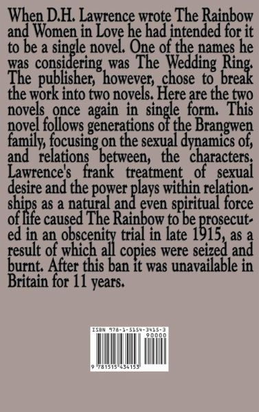 When D.H. Lawrence wrote The Rainbow and Women in Love he had intended for it to be a single novel. One of the names he was considering was The Wedding Ring. The publisher, however, chose to break the work into two novels. Here are the two novels once again in single form. This novel follows generations of the Brangwen family, focusing on the sexual dynamics of, and relations between, the characters.