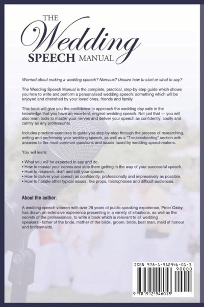 Do an outstanding wedding speech - in 7 easy steps! Do you need to do a wedding speech but have no idea how to start or what to say? Are you nervous about standing up and speaking in public? Or do you just need some pointers to get that speech 100% awesome? Are you looking for a practical guide to walk you through the whole wedding speech process? The Wedding Speech Manual is here for you. Your 7 Steps to Wedding Speech Success - I will show you: Preparation - how to calm your nerves and be fully prepared before and on the wedding day Get your material - three simple ways to get you overflowing with ideas in no time - your main problem will be what to leave out! Structure and write your speech - how to turn those ideas into a great speech quickly and painlessly Edit your speech - how to polish your speech into the best it can possibly be Practice - the secret sauce - massively boost your confidence and ability to stand up and deliver your speech Delivery - do your speech as confidently, calmly and impressively as any professional Troubleshooting - so you're 100% prepared for anything that could possibly happen! The Wedding Speech Manual is your complete, practical, step-by-step guide to writing and performing a personalised wedding speech which will be enjoyed and cherished by your loved ones, friends and family. "Thank you very much Mr Peter Oxley, the wedding was yesterday and the speech went down a storm. This book helped me so much, everyone said I nailed it. If anyone out there has a wedding speech to do soon, then forget the rest, this book is the only one you'll need or want. Thanks again" - Robert Butler This comprehensive yet readable guide is for all wedding speakers - father of the bride, groom, best man, brides, mothers of the bride, bridesmaids - and will: Give you the confidence that you have an excellent, original wedding speech which hits all the right notes Get your wedding speech written quickly - so you can focus on practising and all the other things you have to do! Show you the tools which the professionals use to master their nerves - so you can deliver your speech confidently, coolly and calmly - and enjoy the big day! The Wedding Speech Manual will show you: What you will be expected to say and do How to master your nerves and stop them getting in the way of your successful speech How to find loads of entertaining and amusing material to fill your speech How to get the audience on your side right from the start The key reasons why so many wedding speeches fail - and how to make sure yours doesn't How to write and perfect your speech - a lot quicker and easier than you ever thought possible The "dreaded wedding speech etiquette" made simple - what you should and shouldn't say How to deliver your speech as confidently, calmly and impressively as possible How to handle all the other stuff which can blind-side a public speaker: like using props, microphones and handling difficult audiences
