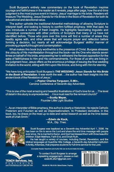 Scott Burgess's entirely new commentary on the book of Revelation inspires courage and faithfulness in the reader as it reveals, page after page, how the end-time judgment is the most joyous event in history: Jesus' marriage to His bride. Readers will treasure The Wedding: Jesus Stands for His Bride in the Book of Revelation for both its educational and devotional value. The author upholds the traditional Adventist methodology of allowing Scripture to interpret itself, and looking to history to confirm fulfilled prophecy. With that said, he also introduces a number of fresh insights. He highlights fascinating linguistic and conceptual connections with other portions of Scripture that many of us have not identified before. Those who pore over this tome will find a number of areas they readily agree with, and other areas that will require prayer and reflection before forming a decision, but nearly all will acknowledge Burgess' skillful manner of provoking prayerful thought and contemplation. What makes this book truly worthwhile is the presence of Christ. Burgess stresses the ubiquity of His manifestation throughout the book—as the One who stands seven times on behalf of His bride, empowering her to withstand the fiercest opposition for the sake of faithfulness to Him and His commandments. For those of us who are living in the judgment hour, Jesus offers us the enormous privilege of issuing the final wedding invitation to the world, sitting with Him upon His throne, and living with Him for eternity.