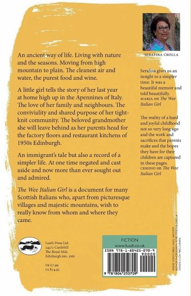 An ancient way of life. Living with nature and the seasons. Moving from high mountain to plain. The cleanest air and water, the purest food and wine. A little girl tells the story of her last year at home high up in the Apennines of Italy. The love of her family and neighbours. The conviviality and shared purpose of her tight knit community. The beloved grandmother she will leave behind as her parents head for the factory floors and restaurant kitchens of 1950's Edinburgh. An immigrant's tale but also a record of a simpler life. At one time negated and cast aside and now more than ever sought out and admired. The Wee Italian Girl is a document for many Scottish Italians who, apart from picturesque villages and majestic mountains wish to really know from whom and where they came.