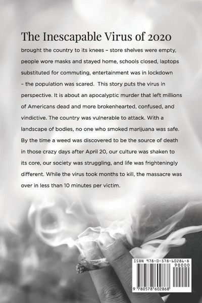 Every year on April 20 marijuana smokers worldwide celebrate a day of fun, all done in the spirit of peace, but this year millions of Americans simultaneously fell dead for unknown reasons. They thank God for the gift of marijuana to humanity. But the order of magnitude for such a widespread killing spree pointed to a man-made event, as Mother Nature could not have been so meticulous in her plan; deliberate in her approach, and thorough in her execution. Twenty-four hours after the annual "smoke-in" the TV Breaking News articles were a series of unbelievable stories, photos, and accounts of an apocalypse. The death count surpassed that of an Atomic Bomb without an enemy or attack to attribute the horror. Without answers as to why bodies were scattered from coast to coast, the public was panic-stricken full of anxiety and fear. Bodies were anywhere a person would go to feel safe to be themselves for a few minutes. The challenge wasn't completed by the poison weed or the act of smoking it. The success of the massacre lay in the production and unique distribution approach to chemical warfare - attack from within. Central to the story's theme is a cross-country 3-tiered structure consisting of an underground tunnel with a canal continuously filled by Global Warming oceans' overflow, a single rail sled, and an above-ground walkway. In peace, the canal would water parched land to produce food for the country's food banks. Unfortunately, the labor to build the structure was a resentful workforce with revenge on their minds. The construction crews were littered with saboteurs who were mixing a "crumble chemical" into the building material such that the wall structure would dissolve not long after it was completed. The enemy's ultimate goal was to control the Western Hemisphere. First, they had to take over the U.S. who was the only country strong enough to stop them. In retrospect, two years earlier a suspicious killer virus struck the U.S. murdering thousands in a poor attempt to wipe-out Americans. But a CDC vaccine diluted the anemic disease from its purpose. It was a strange event that surfaced many questions about where it began and the human condition that started it. But the plan needed to be swift, thorough, and safe from self-inflicting harm and malicious discovery. The enemy's combined forces remained mysterious. The fighting force known as the Western Hemisphere Armed Forces (WHAF) had yet to invade the U. S. Aside from gaining residence and familiarity with our land, they worked at gaining the Americans' trust. but their The infiltrator segment adjusted well to our lifestyles socializing with our families and friends in plain sight.Quite by accident, I came to possess a cryptic map with the shape of the United States drawn on it - a left-hand overlay was sketched over the U. S. - the map resembled a marijuana leaf. Without any of the lines labeled, nothing I looked at made sense. When I learned the man, who slid the map to me, as he was being dragged from a barroom, paid for it with his life, I was convinced the drawing was tied to the massacre in some way. Before the Americans could regroup into what was left of their powerful fighting force, the WHAF attacked by landing on the California coast. They took no prisoners, except the ones they needed. All foreign survivors had the back of their right hand unmistakably tattooed with the date they were captured. Most were deported, while others were kept in labor camps to work on the country's infrastructure destruction. A few escaped never to be seen again.