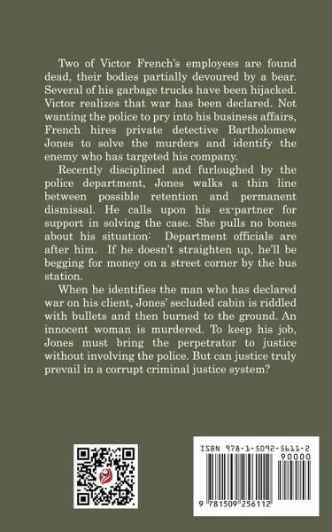 Two of Victor French's employees are found dead, their bodies partially devoured by a bear. Several of his garbage trucks have been hijacked. Victor realizes that war has been declared. Not wanting the police to pry into his business affairs, French hires private detective Bartholomew Jones to solve the murders and identify the enemy who has targeted his company. Recently disciplined and furloughed by the police department, Jones walks a thin line between possible retention and permanent dismissal. He calls upon his ex-partner for support in solving the case. She pulls no bones about his situation: Department officials are after him. If he doesn't straighten up, he'll be begging for money on a street corner by the bus station. When he identifies the man who has declared war on his client, Jones' secluded cabin is riddled with bullets and then burned to the ground. An innocent woman is murdered. To keep his job, Jones must bring the perpetrator to justice without involving the police. But can justice truly prevail in a corrupt criminal justice system?