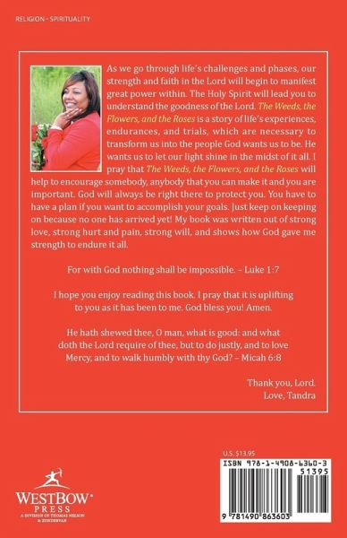 As we go through life's challenges and phases, our strength and faith in the Lord will begin to manifest great power within. The Holy Spirit will lead you to understand the goodness of the Lord. The Weeds, the Flowers, and the Roses is a story of life's experiences, endurances, and trials, which are necessary to transform us into the people God wants us to be. He wants us to let our light shine in the midst of it all. I pray that The Weeds, the Flowers, and the Roses will help to encourage somebody, anybody that you can make it and you are important. God will always be right there to protect you. You have to have a plan if you want to accomplish your goals. Just keep on keeping on because no one has arrived yet! My book was written out of strong love, strong hurt and pain, strong will, and shows how God gave me strength to endure it all. For with God nothing shall be impossible. - Luke 1:7 I hope you enjoy reading this book. I pray that it is uplifting to you as it has been to me. God bless you! Amen. He hath shewed thee, O man, what is good: and what doth the Lord require of thee, but to do justly, and to love Mercy, and to walk humbly with thy God? - Micah 6:8 Thank you, Lord. Love, Tandra