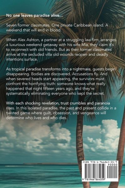 No one leaves paradise alive... Seven former classmates. One private Caribbean island. A weekend that will end in blood. When Alex Ashton, a partner at a struggling law firm, and his wife Mia arrange a luxurious weekend getaway, they claim it's to reconnect with old friends. But as their former classmates arrive at the secluded villa, old wounds reopen, and deadly intentions surface. As tropical paradise transforms into a nightmare, guests begin disappearing. Bodies are discovered. Accusations fly. And when severed heads start appearing, the survivors must confront the horrifying truth: someone knows what really happened that night fifteen years ago, and they're systematically eliminating everyone who kept the secret. With each shocking revelation, trust crumbles, and paranoia rises. In this isolated paradise, the past and present collide in a twisted game where guilt, obsession, and vengeance will determine who lives and who dies. Perfect for fans of Frieda McFadden, Ruth Ware, and Lucy Foley, THE WEEKEND GETAWAY delivers shocking twists, complex psychological suspense, and a haunting exploration of how our darkest moments can define us forever.