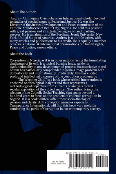 Corruption in Nigeria as it is in other nations facing the humiliating challenges of its evil is a topical burning issue. Aside its dysfunctionality to any developmental process, its associative moral odium has particularly compounded Nigeria's image problem both domestically and internationally. Predictably, this has elicited profound intellectual discourse of the corruption problematic. "The Weeping Child" is a book whose critical intervention is anchored on theological insights and thus represents a methodological departure from currents of analysis rooted on secular exposition on the subject matter.