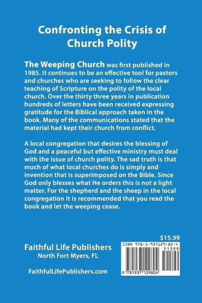 The Weeping Church was first published in 1985. It continues to be an effective tool for pastors and churches who are seeking to follow the clear teaching of scripture on the polity of the local church. Over the thirty three years in publication hundreds of letters have been received expressing gratitude for the Biblical approach taken in the book. Many of the communications stated that the material had kept their church from conflict. A local congregation that desires the blessing of God and a peaceful but effective ministry must deal with the issue of church polity. The sad truth is that much of what local churches do is simply and invention that is superimposed on the Bible. Since God only blesses what He orders this is not a light matter. For the shepherd and the sheep in the local congregation it is recommended that you read the book and let the weeping cease.