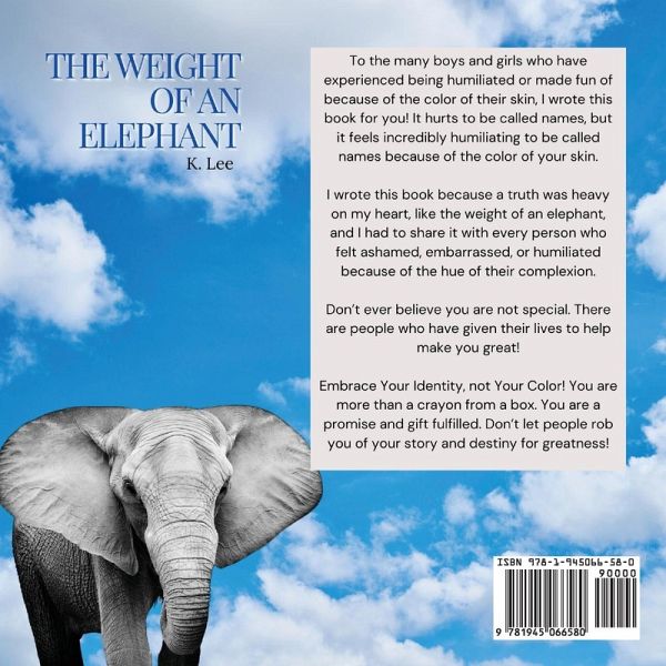 A truth was heavy on my heart, like the weight of an elephant, and I had to share it with every person who has ever felt ashamed, embarrassed, or humiliated because of the color of their skin. Don't ever believe you are not special. There are people who have given their lives to help make you great, and many more who want to make sure they tell your story of victory and power! Embrace Your Identity, not Your Color! You are more than a crayon from a box. You are a promise and gift fulfilled. Don't let people rob you of your story and destiny for greatness! Enjoy this empowering and encouraging read for any child. I want to encourage us all. As we find our balance in knowing who we are and what makes us valuable, we can make the weight of the elephant so light we can jump through the air with change. It doesn't remove the stigma that some people will see, but it will rebuild in us a vision of our beauty and purpose. True and divine beauty is more than skin deep. It is our heart, mind, and intention to treat all people with value as designed.