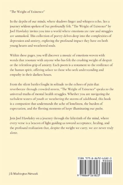 The Weight of Existence In the depths of our minds, where shadows linger, and whispers echo, lies a journey seldom spoken of but profoundly felt. "The Weight of Existence" by Joel Hawksley invites you into a world where emotions are raw, and struggles are unmasked. This collection of poetry delves deep into the complexities of depression and anxiety, exploring the profound impact they have on both young hearts and weathered souls. Within these pages, you will discover a mosaic of emotions woven with words that resonate with anyone who has felt the crushing weight of despair or the relentless grip of anxiety. Each poem is a testament to the resilience of the human spirit, offering solace to those who seek understanding and empathy in their darkest hours. From the silent battles fought in solitude to the echoes of pain that reverberate through crowded streets, "The Weight of Existence" speaks to the universal truths of mental health struggles. Whether you are navigating the turbulent waters of youth or weathering the storms of adulthood, this book is a companion that understands the ache of loneliness, the burden of expectation, and the fleeting moments of hope illuminating our paths. Join Joel Hawksley on a journey through the labyrinth of the mind, where every verse is a beacon of light guiding us toward acceptance, healing, and the profound realization that, despite the weight we carry, we are never truly alone.