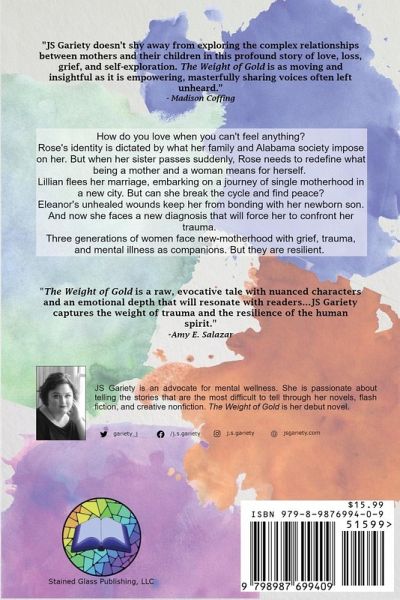Rose's identity has always been defined by what her family and Alabama society has imposed on her. When her sister's death leaves behind two children who need a mother, can Rose forge her own path, or will depression and grief define her forever? Lillian has been running to find something good. She doesn't know there's a name for the pain in her mind and the vices she can't seem to shake. Can she break the cycle and finally find safety for her family? Eleanor is not the same person she was. Unhealed wounds have stolen the joy she'd always expected to feel in motherhood. How can she love when she can't feel anything? These are the untold stories of mothers across generations. In The Weight of Gold, JS Gariety pulls back the curtain on mental health challenges and stigmas that many mothers have faced. Inspired by real stories.