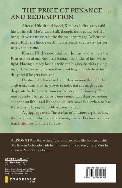 In The Weight of Shadows, by Alison Strobel, after a difficult childhood, Kim has built a successful life for herself ... but she'd leave it all if it meant being rid of the guilt she harbors over a tragic mistake she made years ago. When she meets Rick, she finds everything she needs--including a way to pay for her sins every time he hits her. Kim and Rick's new neighbor, Joshua, knows more than Kim realizes about Rick, but Joshua has battles of his own to fight. Soon to intersect Kim's and Rick's lives is Debbie, who has saved countless women from abuse through the shelter she runs, but Debbie might be as desperate for love as the women she serves. Meanwhile, as Rick's wrath extends to their baby, Kim must decide if her penance is more important than protecting that innocent life--and if she should dare leave Rick when he has the power to bring her hidden crime to light.