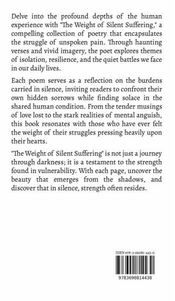 Delve into the profound depths of the human experience with "The Weight of Silent Suffering," a compelling collection of poetry that encapsulates the struggle of unspoken pain. Through haunting verses and vivid imagery, the poet explores themes of isolation, resilience, and the quiet battles we face in our daily lives. Each poem serves as a reflection on the burdens carried in silence, inviting readers to confront their own hidden sorrows while finding solace in the shared human condition. From the tender musings of love lost to the stark realities of mental anguish, this book resonates with those who have ever felt the weight of their struggles pressing heavily upon their hearts. "The Weight of Silent Suffering" is not just a journey through darkness; it is a testament to the strength found in vulnerability. With each page, uncover the beauty that emerges from the shadows, and discover that in silence, strength often resides.