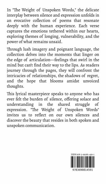 In "The Weight of Unspoken Words," the delicate interplay between silence and expression unfolds in an evocative collection of poems that resonate deeply with the human experience. Each verse captures the emotions tethered within our hearts, exploring themes of longing, vulnerability, and the power of what remains unsaid. Through lush imagery and poignant language, the collection delves into the moments that linger on the edge of articulation-feelings that swirl in the mind but can't find their way to the lips. As readers journey through the pages, they will confront the intricacies of relationships, the shadows of regret, and the hope that blooms amidst unvoiced thoughts. This lyrical masterpiece speaks to anyone who has ever felt the burden of silence, offering solace and understanding in the shared struggle of expression. "The Weight of Unspoken Words" invites us to reflect on our own silences and discover the beauty that resides in both spoken and unspoken communication.